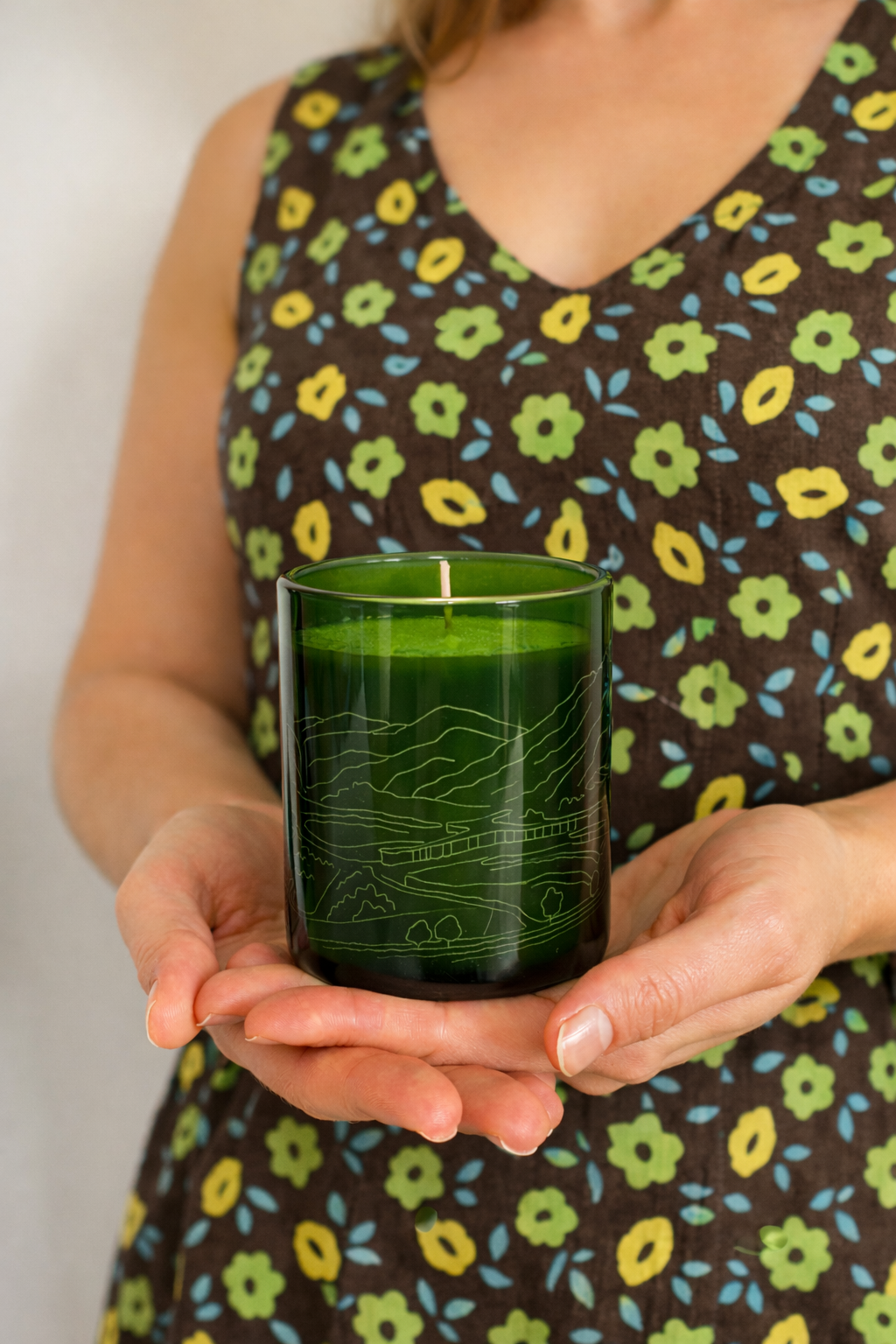 The engraving for Lori captures the quiet dialogue between the green Armenian valley and a modern hotel structure nestled within it.